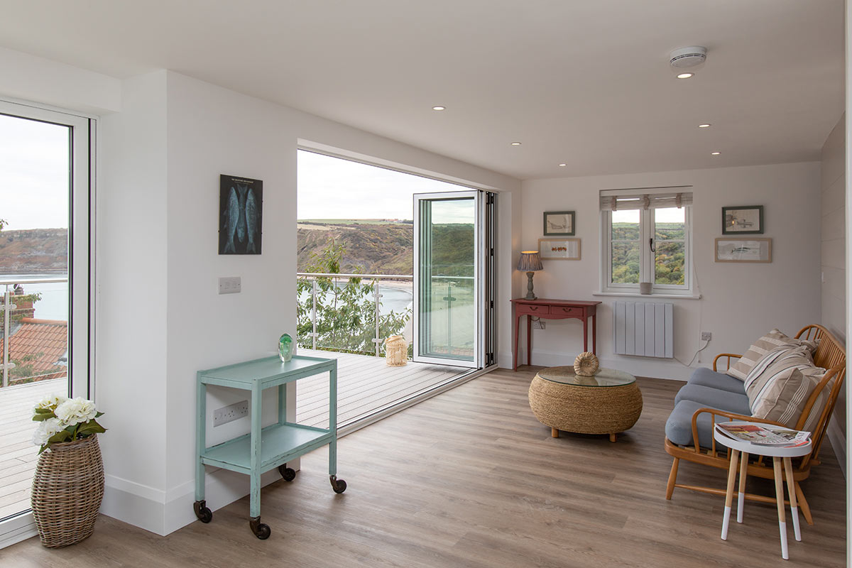 Outside, there is a large Indian slate patio with outside seating, table and chairs. Gorgeous uninterrupted views of the bay from this private vantage point - a rarity in Runswick Bay.